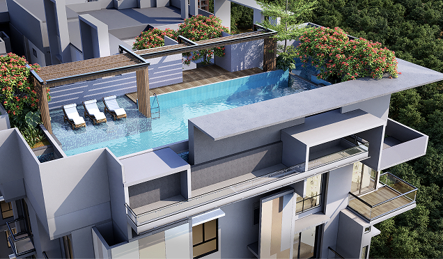 From the quiet charm of lush surroundings on the ground to the gentle gleam of a rooftop swimming pool against the sky, modern amenities are seamlessly woven into a setting that feels serene, open, and effortlessly refined.